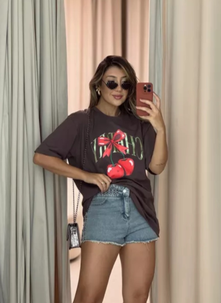 T-shirt em tecido algodão, toque macio,manga soltinha,modelo ouver ,gola redonda de Ribana e alongada. Estampa cereja na frente a mais pedida do momento.